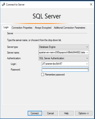 The dialog form should now look like this. You can optionally check the ‘Remember password’ checkbox. This will save the password so that if you close and reopen SSMS you may not need to enter in the password again.