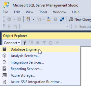 If you do not see the above dialog, look for the ‘Object Explorer’ window. Then click the ‘Connect>Database Engine’ button. If you do not see the ‘Object Explorer’ window, select View>Object Explorer from the menu.