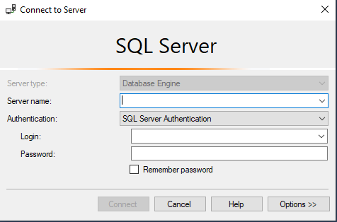 After installing or locating the program, start SQL Server Management Studio (SSMS). You will be prompted with a dialog that looks like this.