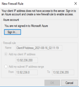 The firewall provides an added later of security to the database. Which is a good thing. But in this case, we need to tell the environment that it is ok for the computer running SQL Server Management Studio to connect to the database.