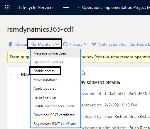 In LCS, on the ‘full details’ page of the environment that contains the database you wish to connect to, select ‘Maintain>Enable access‘.