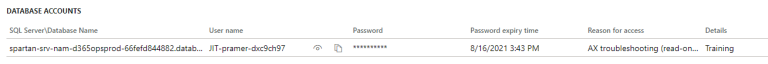 Afterwards, wait a few minutes, then click ‘refresh’ on your browser to reload the page. You should now see a new section labeled ‘Database accounts’. This section provides the information on how to connect to a Test D365 Database.